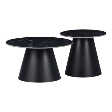 Set de 2 Măsuțe de Cafea Suprapozabile cu Blat din Marmură Lucioasă și Sticlă, Structură din Metal și Sertare, 60x60x42 cm + 50x50x34 cm, Negru